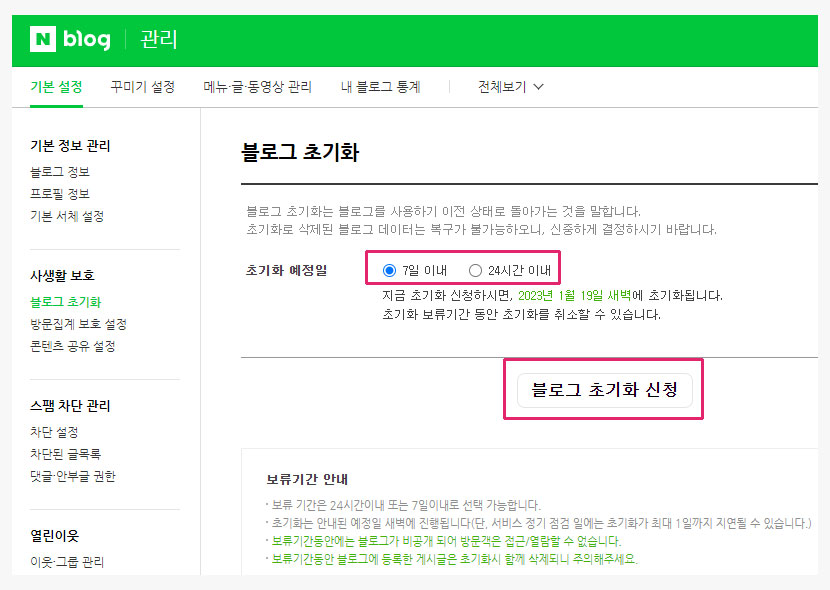 블로그의 관리자 화면에 접속하여 왼쪽의 사생활 보호 – 블로그 초기화 메뉴를 선택해 주시면 위와 같은 화면이 나오게 됩니다. 7일 이내, 24시간 이내를 선택할 수 있으며 상황에 맞는 항목을 선택해 주시면 됩니다.