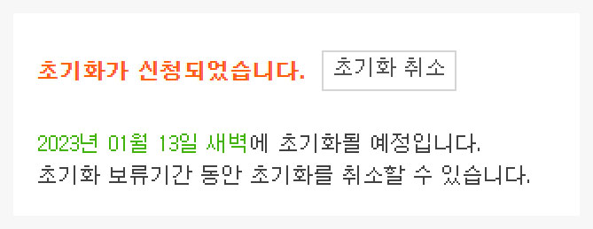 초기화 신청되었다는 문구와 함께 24시간 후에 초기화될 예정이라고 하네요.