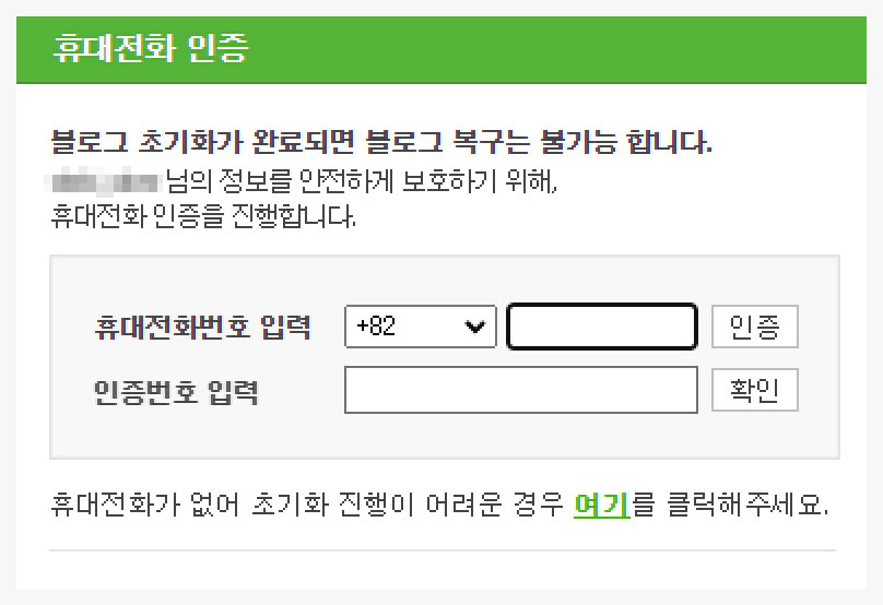 블로그를 초기화하기 전 휴대전화를 통해 인증을 진행하게 됩니다.