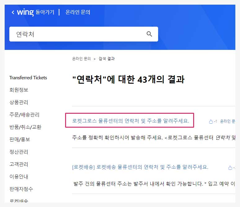 온라인 문의 페이지가 나오면 검색창에 ‘연락처‘라고 입력하고 검색 결과에서 ‘로켓그로스 물류센터의 연락처 및 주소를 알려주세요‘ 글을 눌러주세요.
