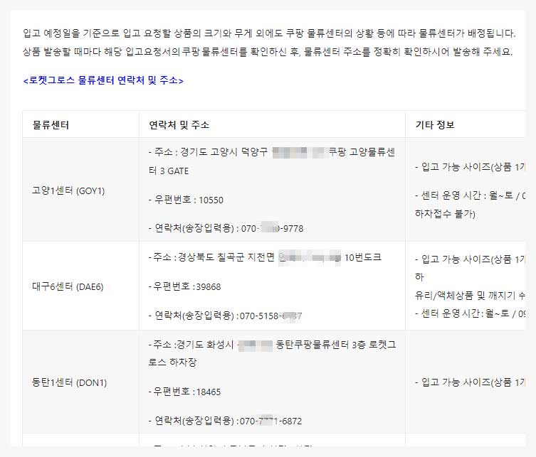 이렇게 로켓그로스 물류센터 연락처와 주소를 확인할 수 있습니다.