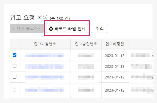 조금 전 생성했던 입고 요청서 항목을 체크하고 상단의 ‘바코드 라벨 인쇄‘ 버튼을 클릭합니다.