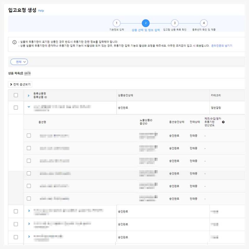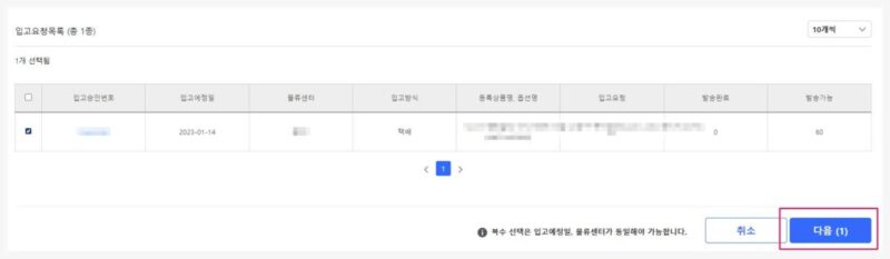 이전 단계에서 생성한 입고요청 목록이 나오면 체크 후 다음을 눌러주세요.