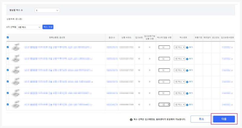 이 단계에서는 발송할 박스 수, 박스에 담을 수량, 박스 번호를 선택할 수 있습니다.