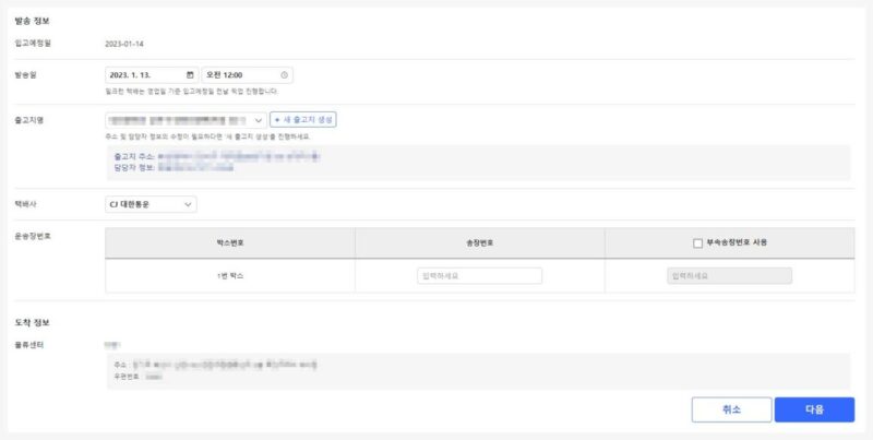 출고지는 기본으로 지정되어 있으니 그대로 두고, 택배사와 운송장 번호를 정확히 입력 후 다음을 눌러주시면 로켓그로스 택배 입고 요청은 완료됩니다.