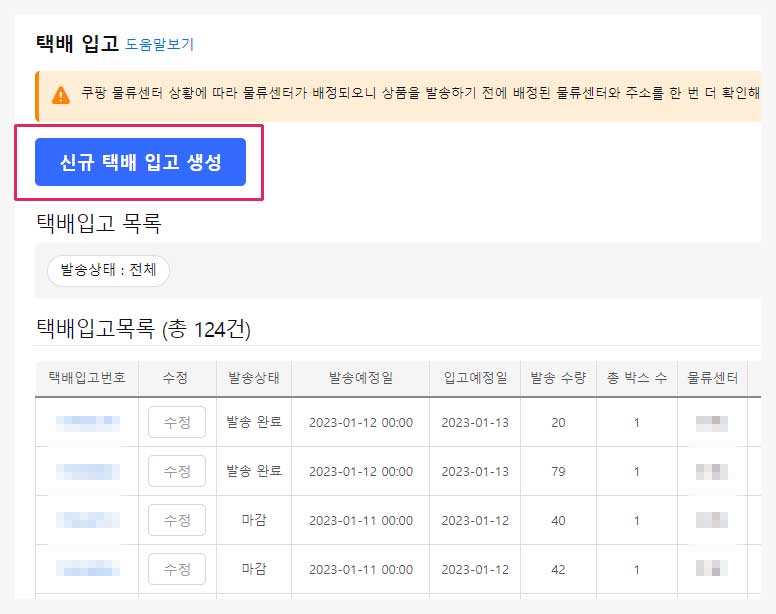 이전 단계에서 입고 요청서를 생성했다면 이제 택배 입고 절차를 진행해야 합니다.