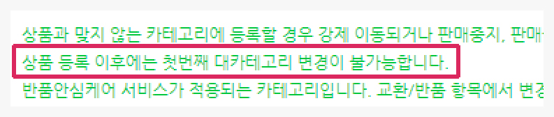 상품 수정 화면에서 카테고리 영역의 하단에 보시면 ‘상품 등록 이후에는 첫 번째 대카테고리 변경이 불가능합니다‘라고 명시되어 있네요.