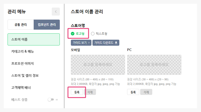 스토어 이름 관리 페이지에서 기본은 ‘텍스트형‘으로 되어있는데 이 항목을 ‘로고형‘으로 변경해 주세요.