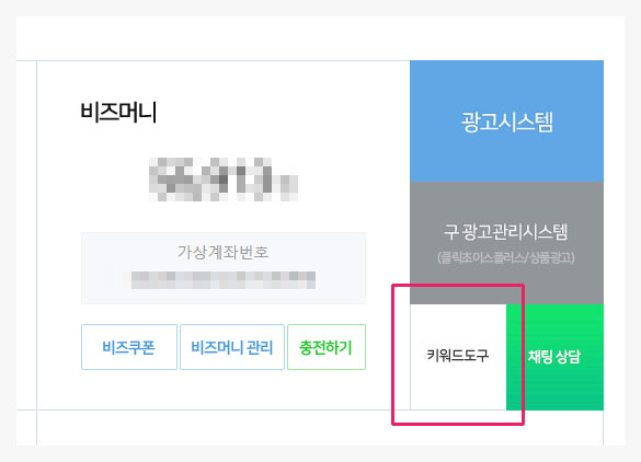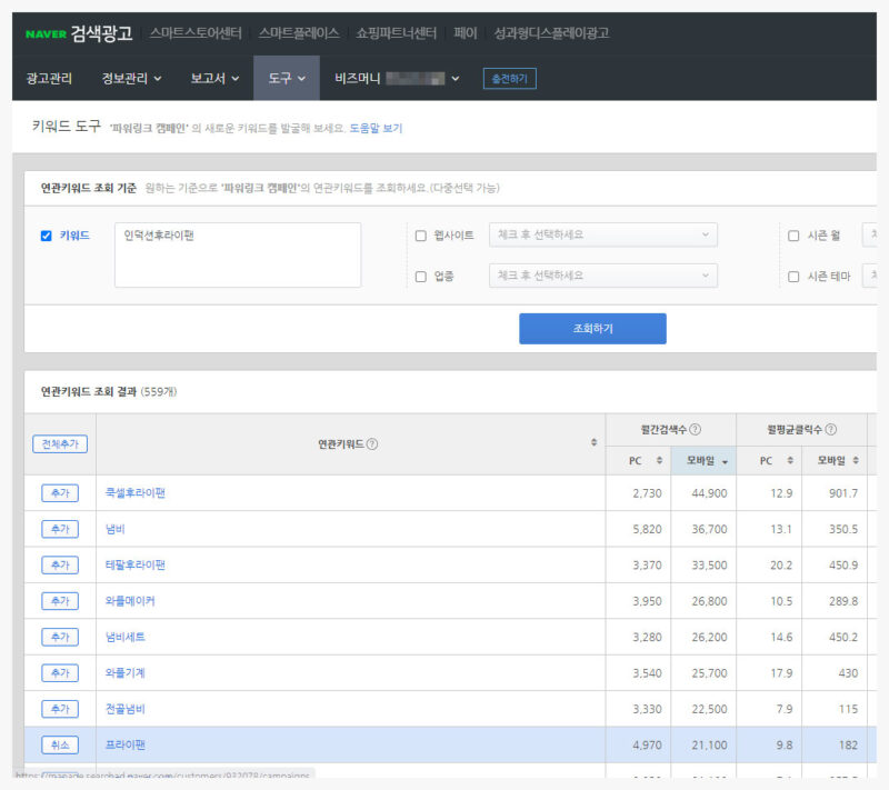 네이버 검색광고의 메인페이지에 키워드도구 메뉴를 클릭해주세요.