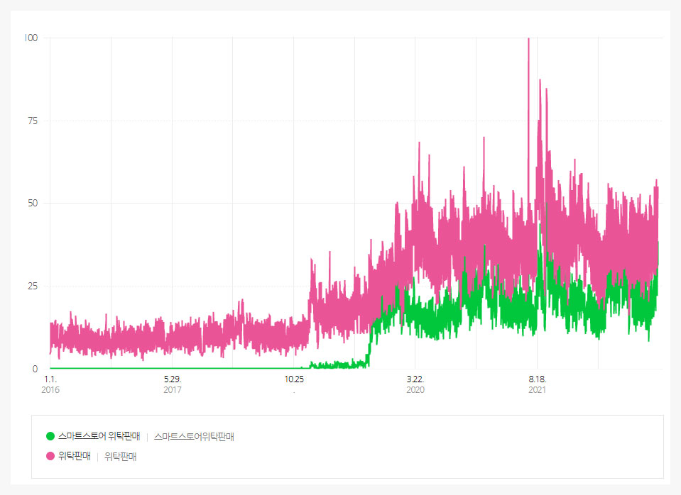 위의 데이터 또한 2019년 하반기부터 위탁판매 관련 검색어의 지수가 급상승합니다.
