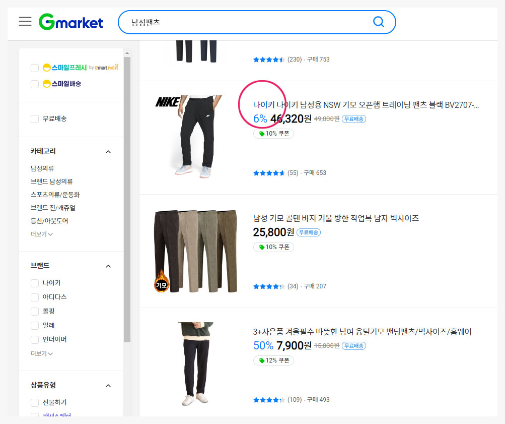 지마켓에서 ‘남성팬츠’로 검색을 한 결과입니다.
