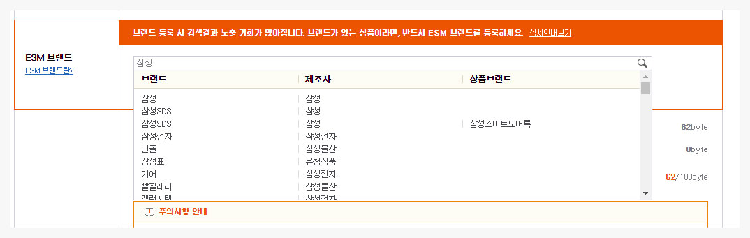 기존에 등록된 브랜드라면 검색 결과가 출력 되며, 해당하는 브랜드명을 선택해주시면 됩니다.