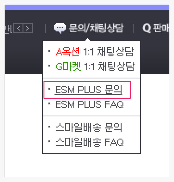 ESMPLUS 화면의 상단에 문의/채팅상담 – ESMPLUS 문의 메뉴가 있습니다.