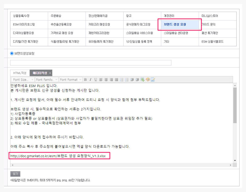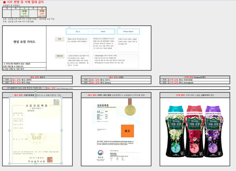 위의 2가지 서류를 준비해 주시고, 본문의 아래쪽에 보시면 브랜드 생성 요청 양식 엑셀파일 URL이 있습니다.