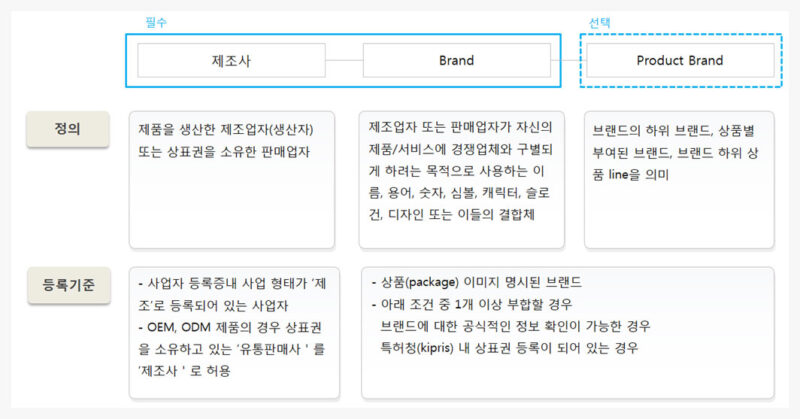 사업자 등록증에 제조(업태)로 등록되어 있거나 상표권을 소유한 판매 업자가 브랜드를 등록할 수 있는 조건이라고 명시되어 있습니다. 쉽게 풀이해 보면 제조와 관계없이 상표권만 소유하고 있으면 조건에 해당하는 것입니다.