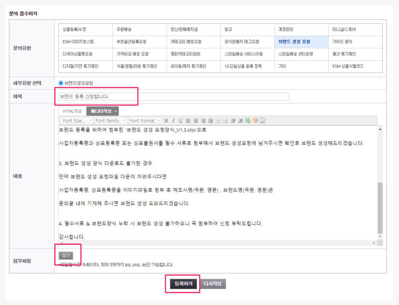 엑셀 파일에 사업자 등록증, 상표등록증, 제품 사진을 첨부했다면 다시 문의 접수하기 화면에서 제목을 작성해 주시고, 첨부파일에 해당 엑셀파일을 등록해 주시면 됩니다.