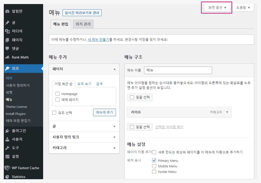 상단의 ‘화면 옵션‘ 메뉴를 클릭해 보겠습니다.