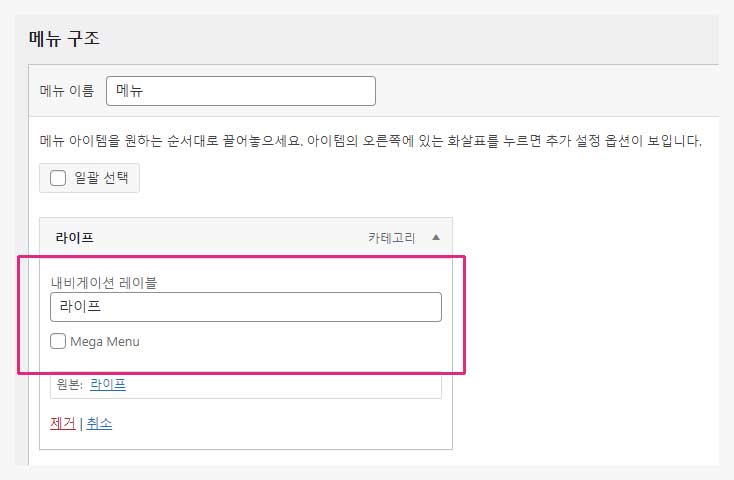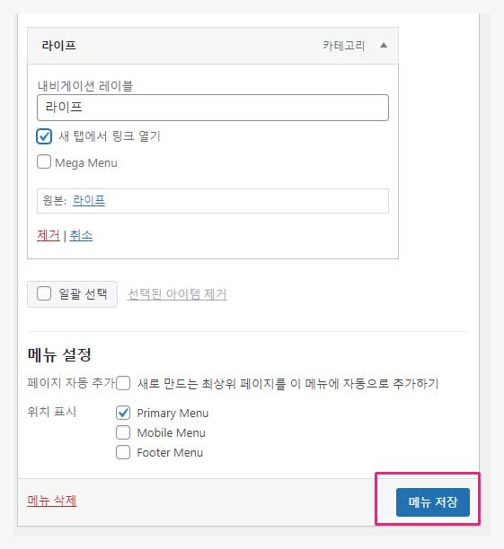 메뉴를 설정하신 후 마지막에 ‘메뉴 저장‘ 버튼을 꼭 눌어주세요.