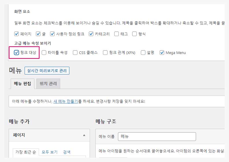 화면 요소가 나오는데 고급 메뉴 속성 보이기 항목에서 ‘링크 대상‘에 체크합니다.