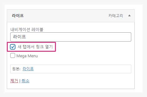 워드프레스를 처음 설치하면 이렇게 ‘새 창으로 열기‘ 항목이 보이지 않습니다.