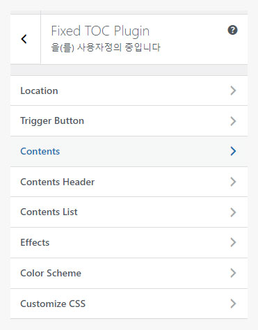 Fixed TOC 플러그인은 기본적인 세팅 메뉴가 있지만 테마 관리 메뉴에 별도의 커스터마이징 기능이 포함되어 있습니다.