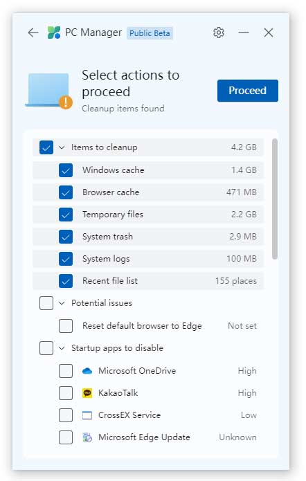 Proceed 버튼을 누르면 캐시와 로그를 삭제할 수 있으며, 아래에 Startup apps to disable 영역에서 윈도우 시작 시 실행되지 않아도 되는 프로그램을 선택해 주시면 해당 기능도 같이 실행되게 됩니다.