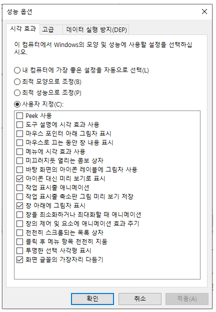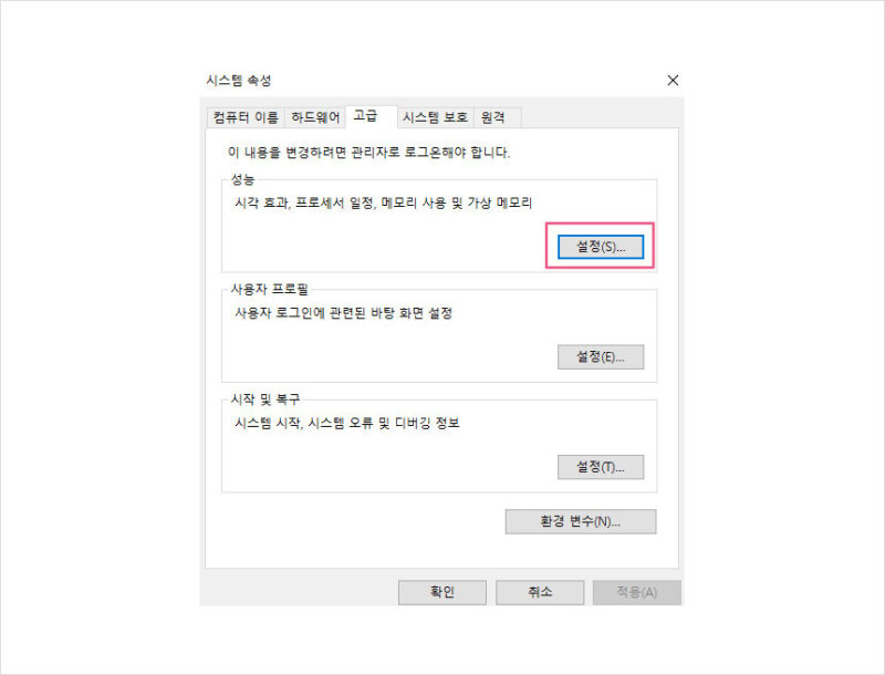 위의 화면이 나오면 고급 – 성능 – 설정 버튼을 클릭해주세요.