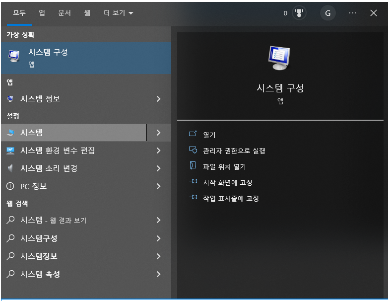 키보드에서 윈도우키를 눌러서 시스템 이라고 입력하면 위와 같은 화면이 나옵니다.