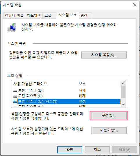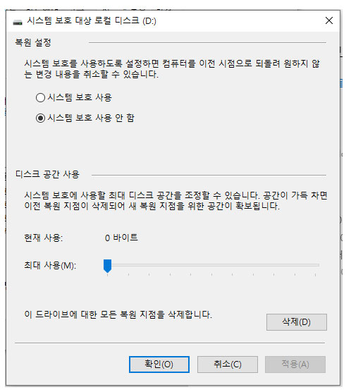 시스템 보호 끄기