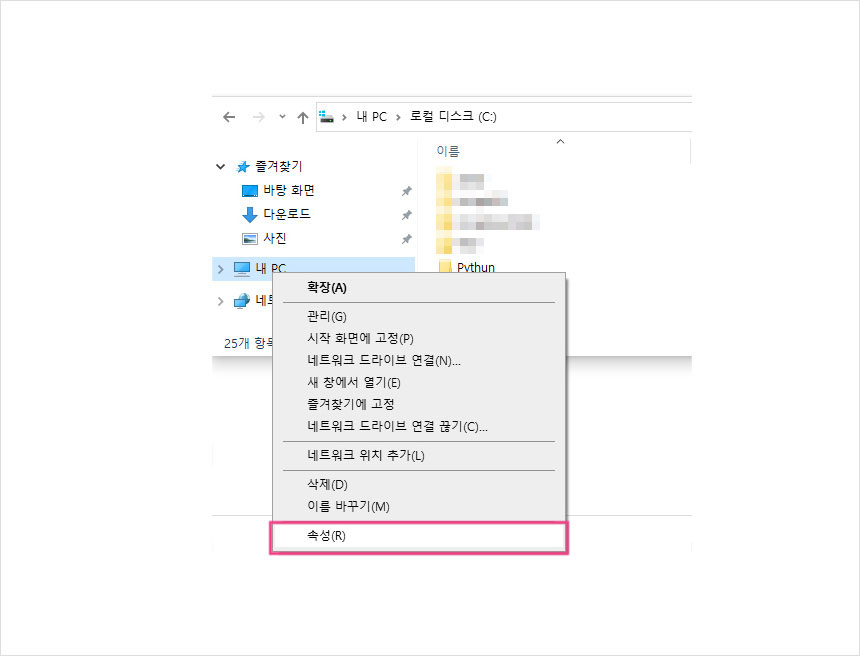 먼저 파일탐색기(윈도우키+E) 를 열어 내 PC 항목에서 마우스 오른쪽버튼을 클릭하여 속성을 클릭해주세요.