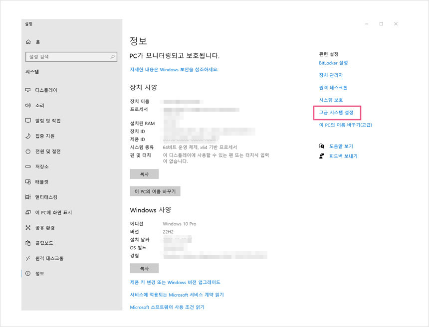 우측 메뉴에서 ‘고급 시스템 설정’을 클릭해주세요.