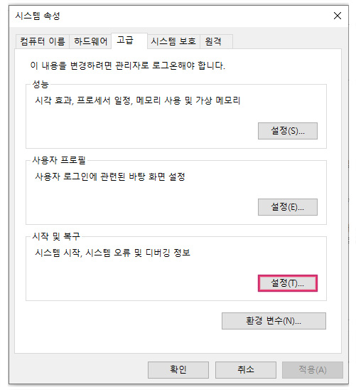 다시 고급 – 시작 및 복구 – 설정 메뉴를 클릭해주세요.