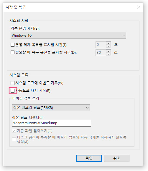 자동으로 다시 시작 체크 표시 해제 후 확인버튼을 클릭해주세요.