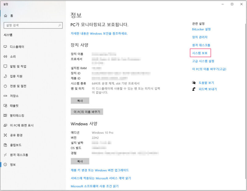 시스템 보호 메뉴를 클릭해주세요