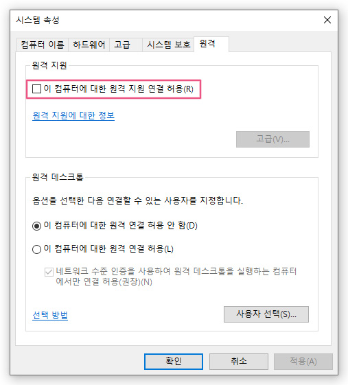 여기서 ‘이 컴퓨터에 대한 원격 지원 연결 허용’을 체크 해제 해주시면 됩니다.