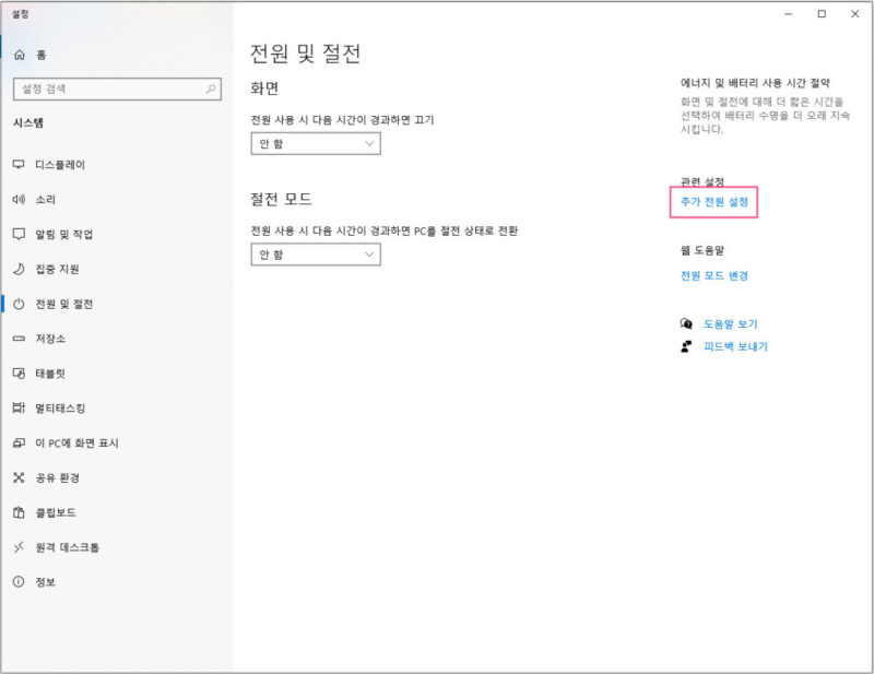 추가 전원 설정 메뉴를 클릭해주세요