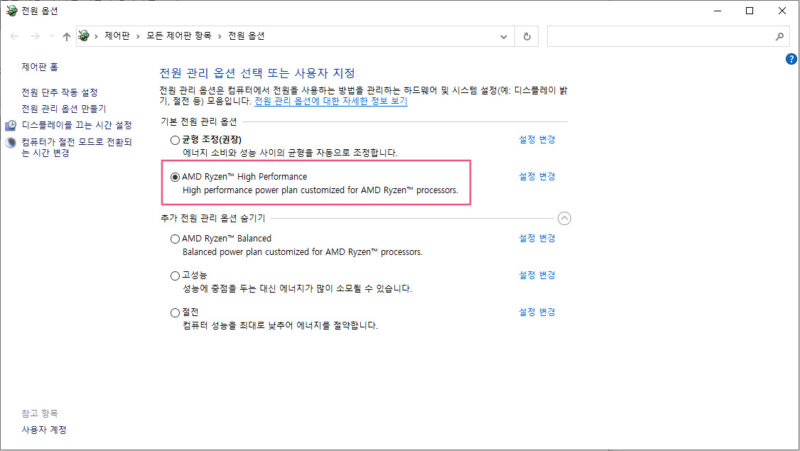 전원 옵션이란 CPU 또는 그래픽카드 등의 하드웨어를 미사용시에 전력을 공급하지 않는 상태로 관리해서 전력소모를 줄이거나 대기상태로 설정하는 기능입니다.