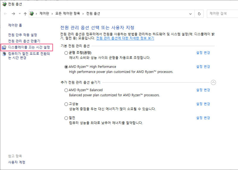 좌측의 디스플레이를 끄는 시간 설정 메뉴를 클릭하시면 조금 더 디테일한 설정이 가능합니다.