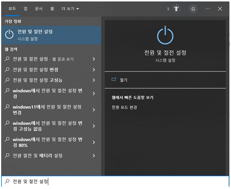윈도우키를 눌러 전원 및 절전 설정 이라고 치면 위와 같은 메뉴가 나오게 됩니다. 메뉴를 클릭해주세요.