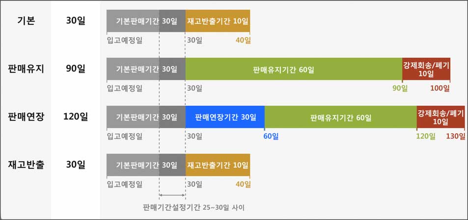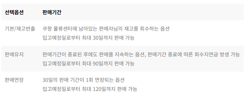 쿠팡에서는 물류센터 입고예정일로부터 30일의 기본 판매 기간을 제공하고 있습니다. 이후 입고 예정일로부터 25~30일 사이에 판매 유지, 판매 연장, 재고 반출 중 1가지를 선택할 수 있습니다.