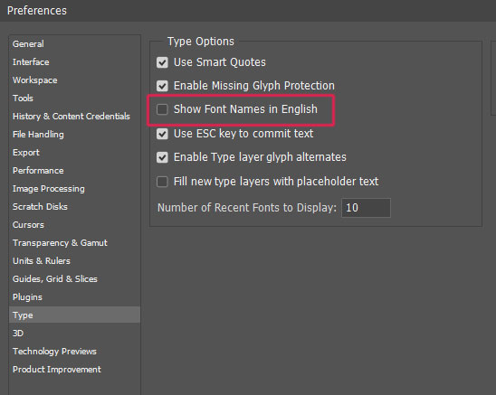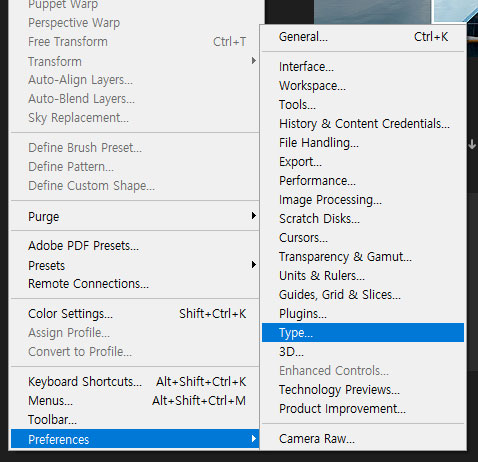Edit > Preferences > Type 메뉴에 들어가주세요.