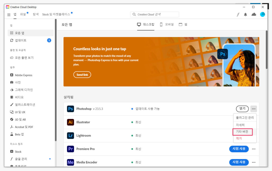 이 페이지에서 모든 앱 – 포토샵 항목을 보시면 우측에 더 보기 메뉴가 있습니다. 눌러서 ‘기타 버전‘을 선택합니다.